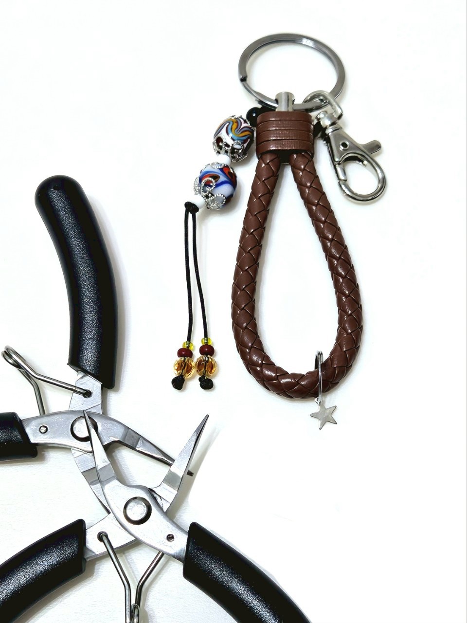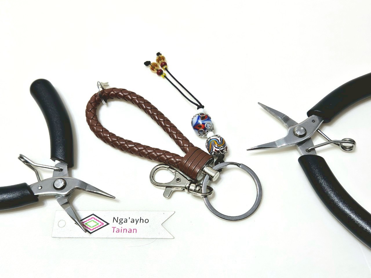 運用彩色尼龍繩與琉璃珠及金工配件搭配出具時尚感的鑰匙圈吊飾。