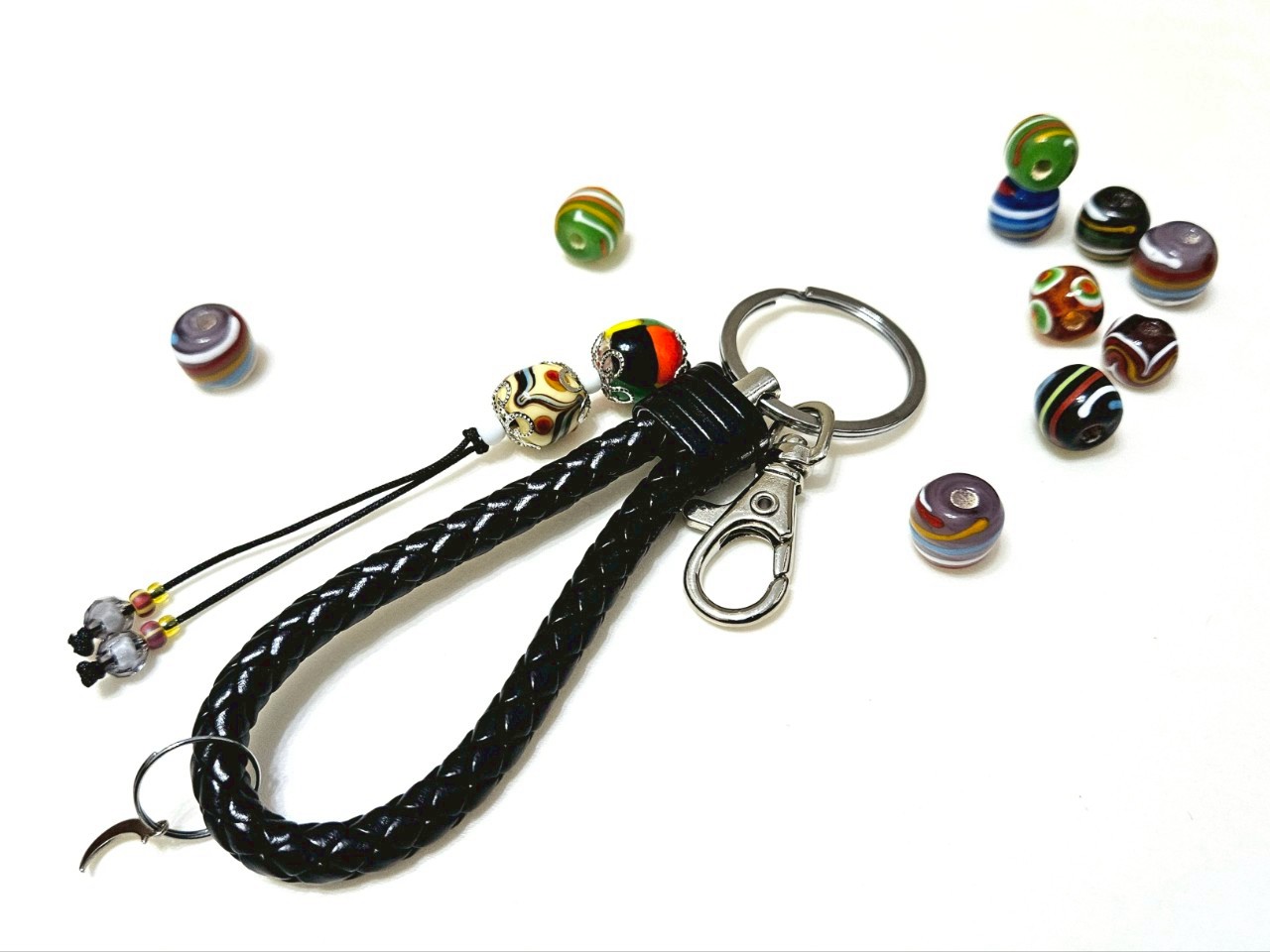 By using colorful nylon ropes, glass beads, and metal accessories, the designer creates these stylish key ring charms.