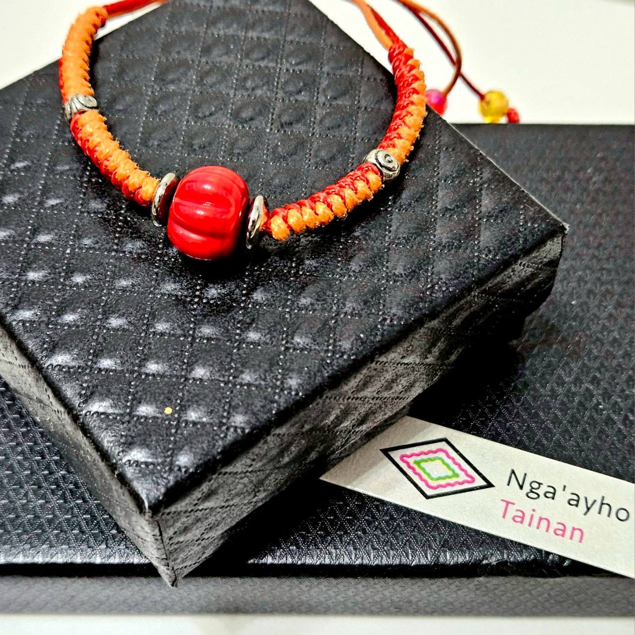 商品使用線條編織方式與琉璃珠做結合,尺寸也能依個人手圍調整,是個可以送禮也能自己配戴的飾品喔。