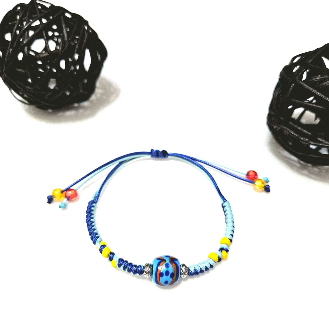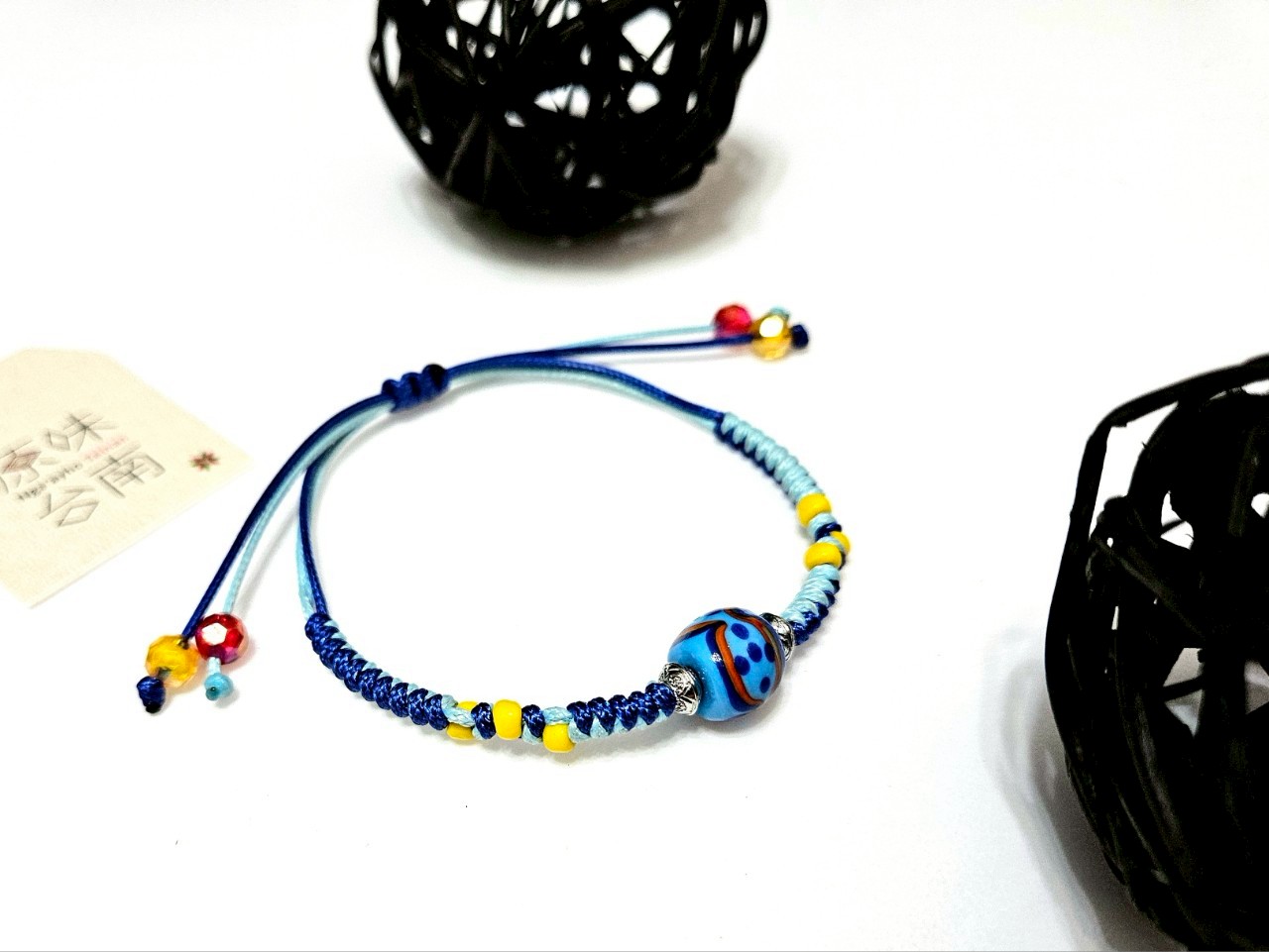 商品使用線條編織方式與琉璃珠做結合,尺寸也能依個人手圍調整,是個可以送禮也能自己配戴的飾品喔。