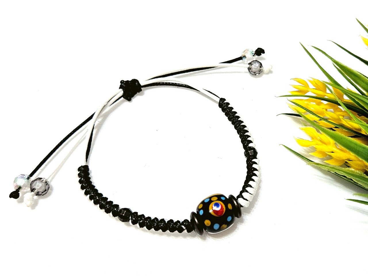 商品使用線條編織方式與琉璃珠做結合,尺寸也能依個人手圍調整,是個可以送禮也能自己配戴的飾品喔。