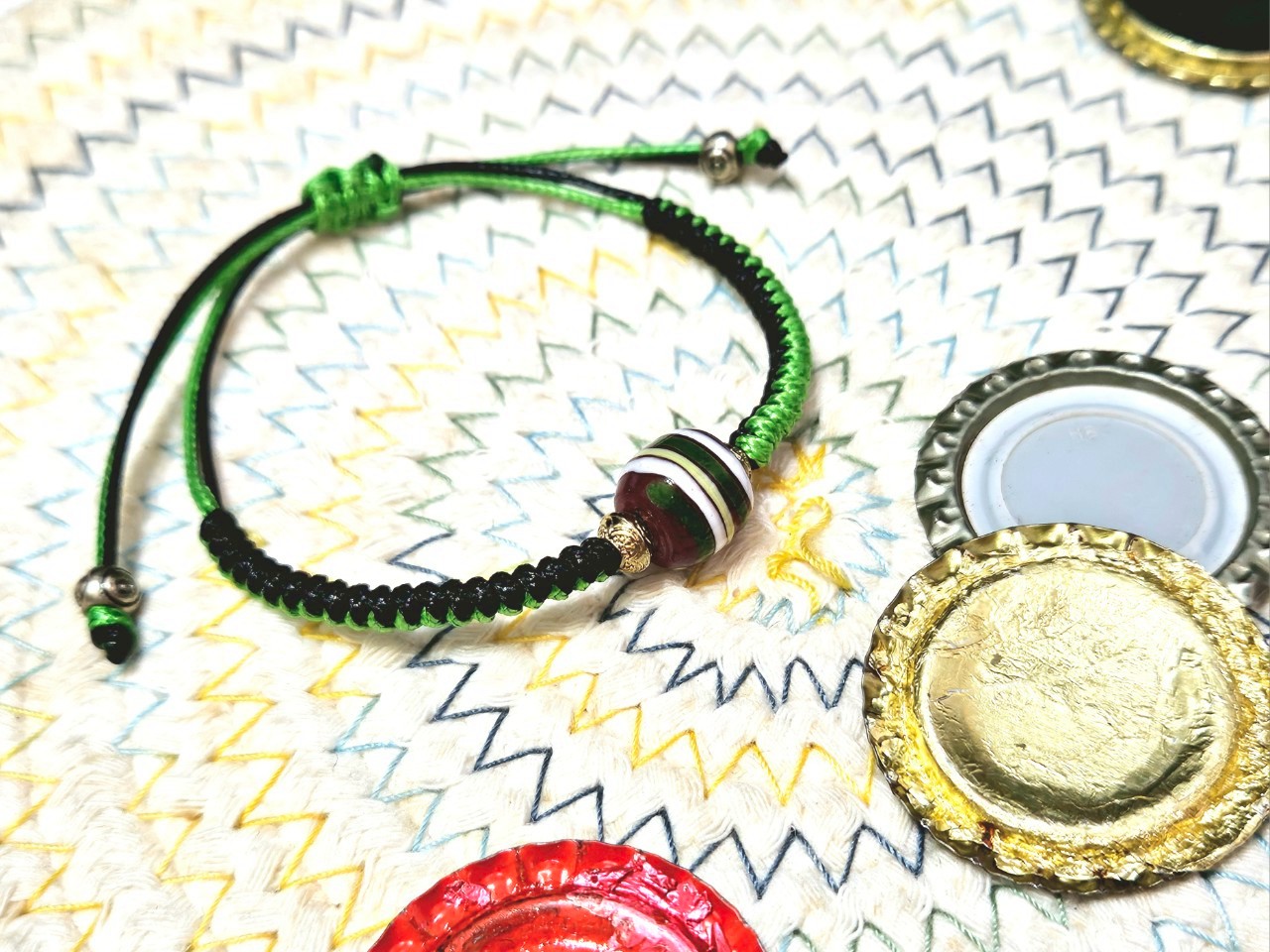 商品使用線條編織方式與琉璃珠做結合,尺寸也能依個人手圍調整,是個可以送禮也能自己配戴的飾品喔。