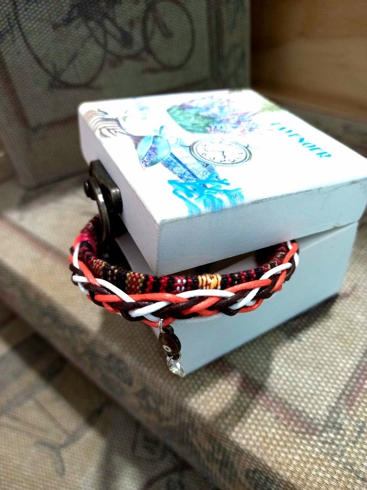以六股編的方式編織再搭配飾品配件與水晶製成有特色的手環,