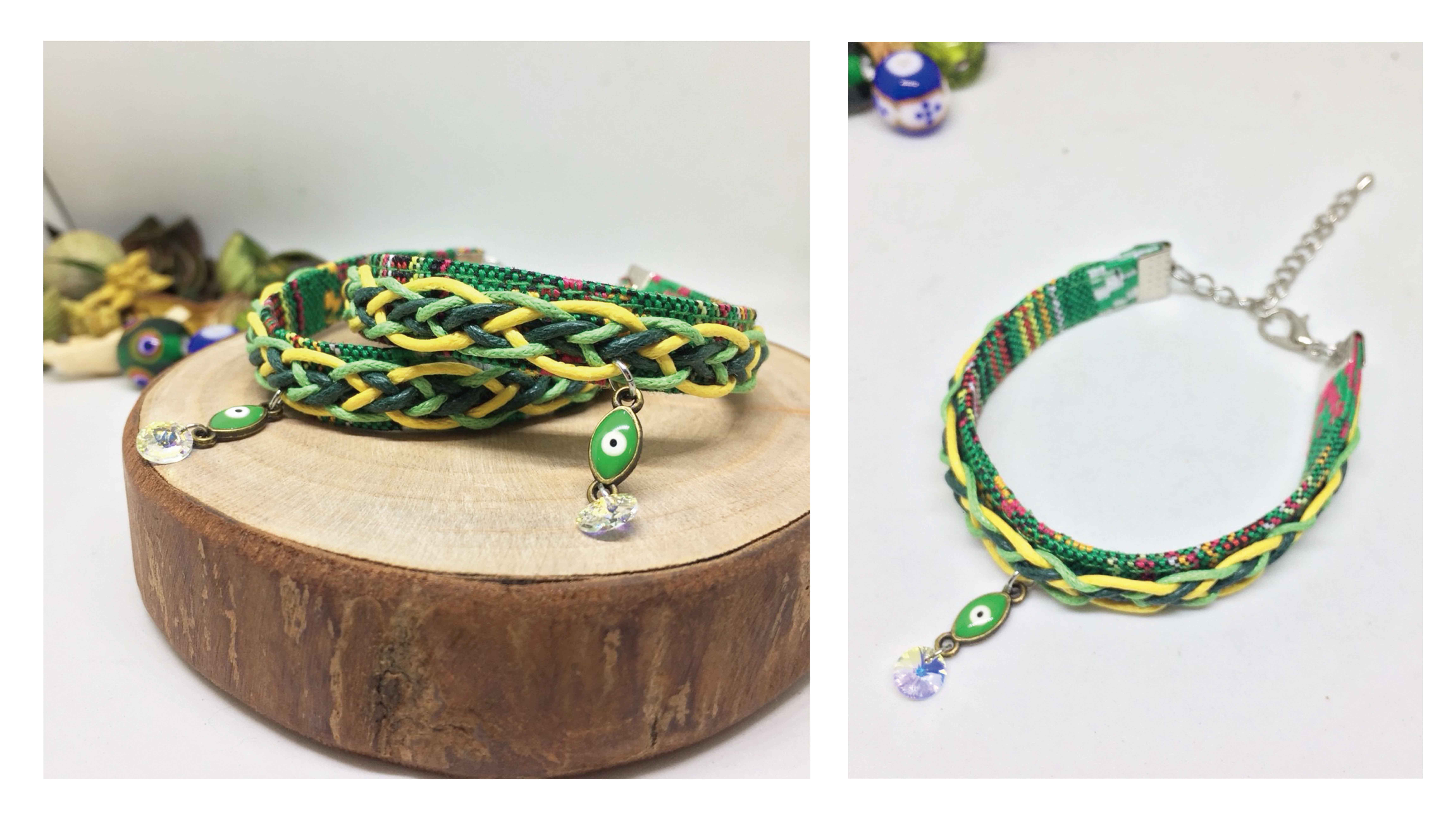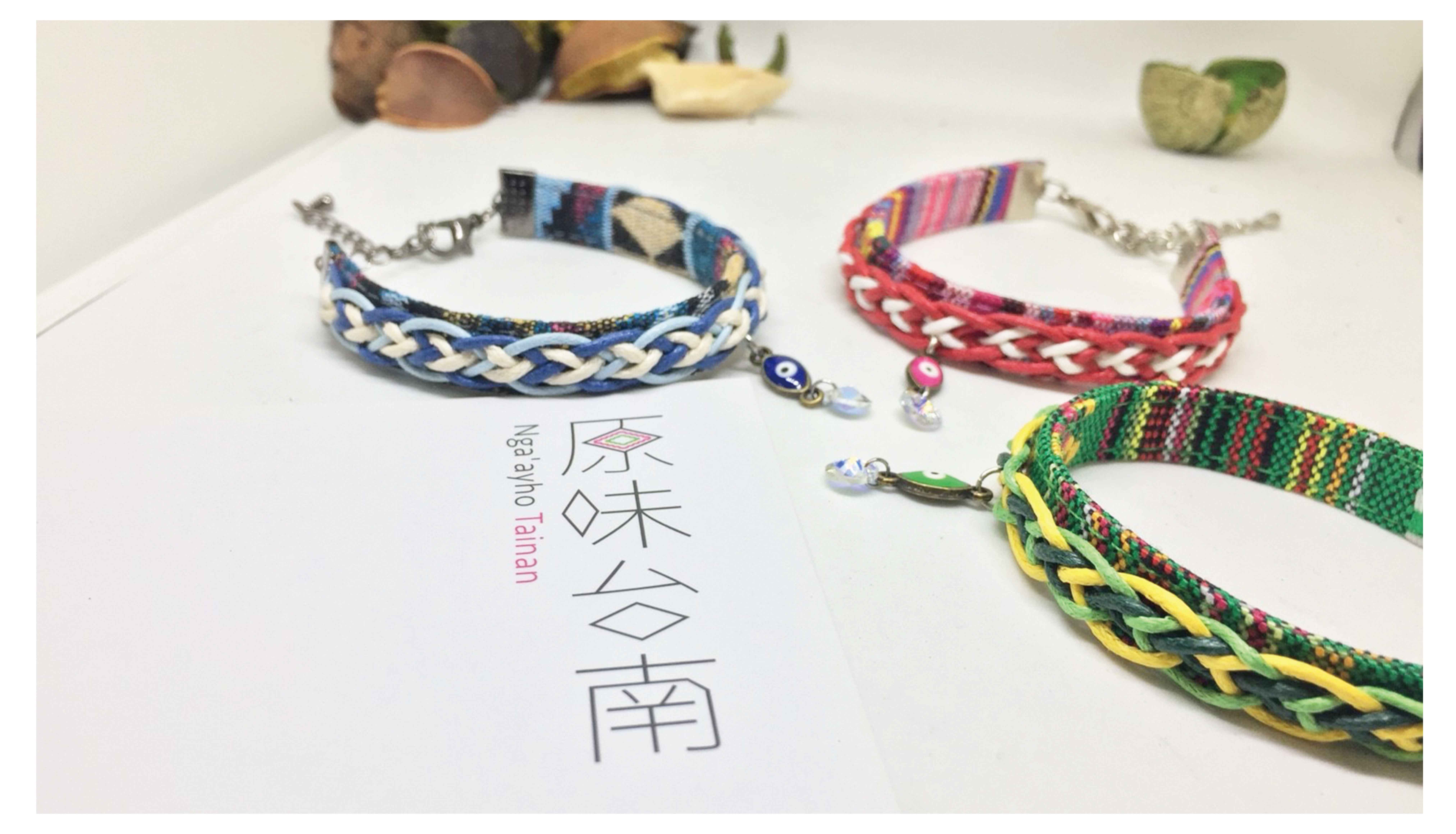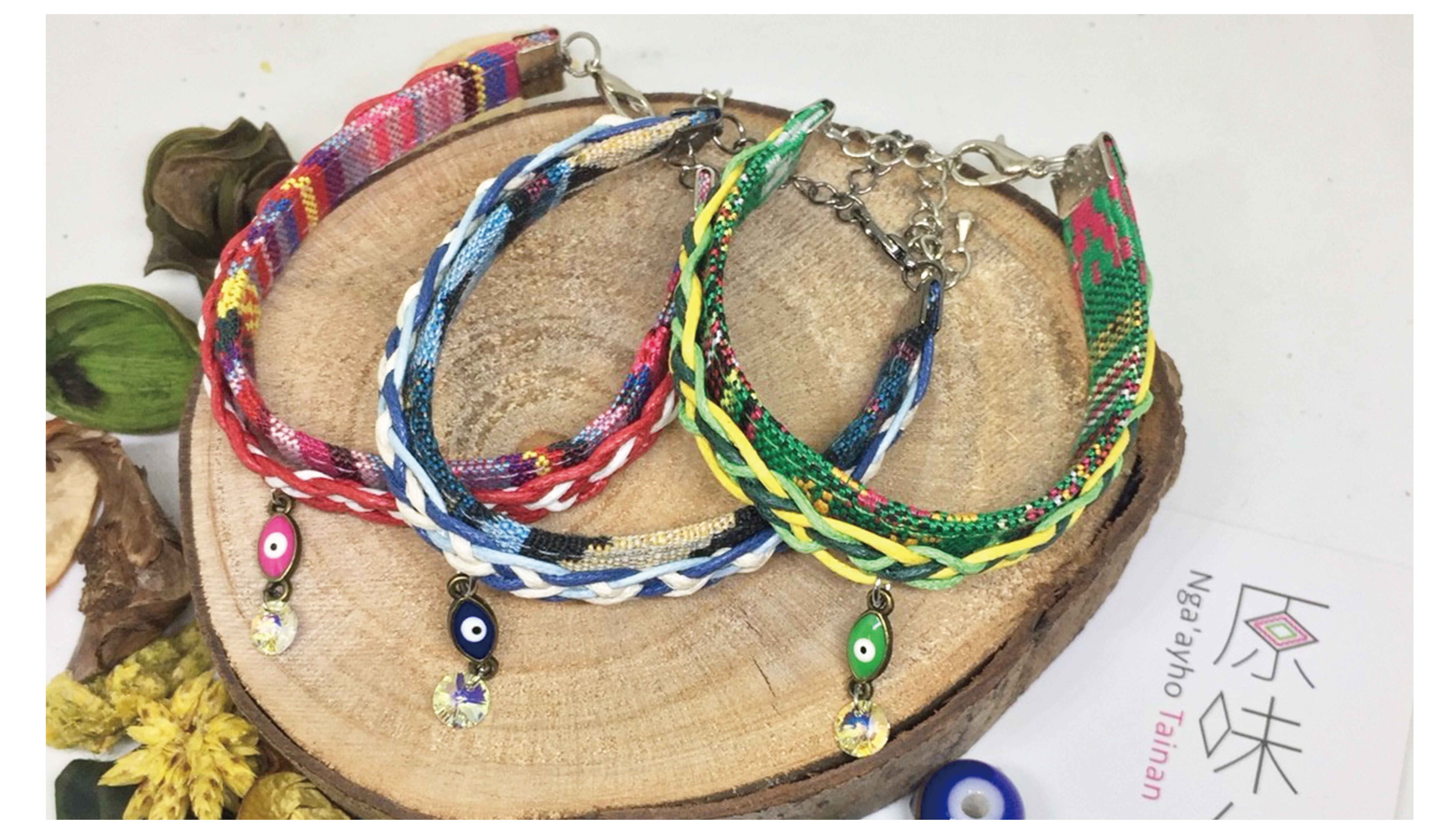 設計師巧思運用台灣原住民族中的圖騰織帶,以六股編的方式編織再搭配飾品配件與水晶製成有特色的手環,