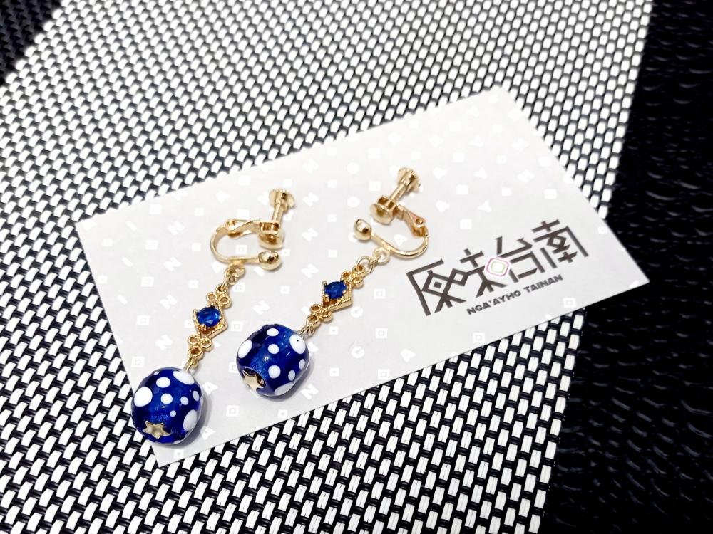 設計師運用了琉璃珠以及水晶的點綴並加上金工配件來製作原民風格的耳環,